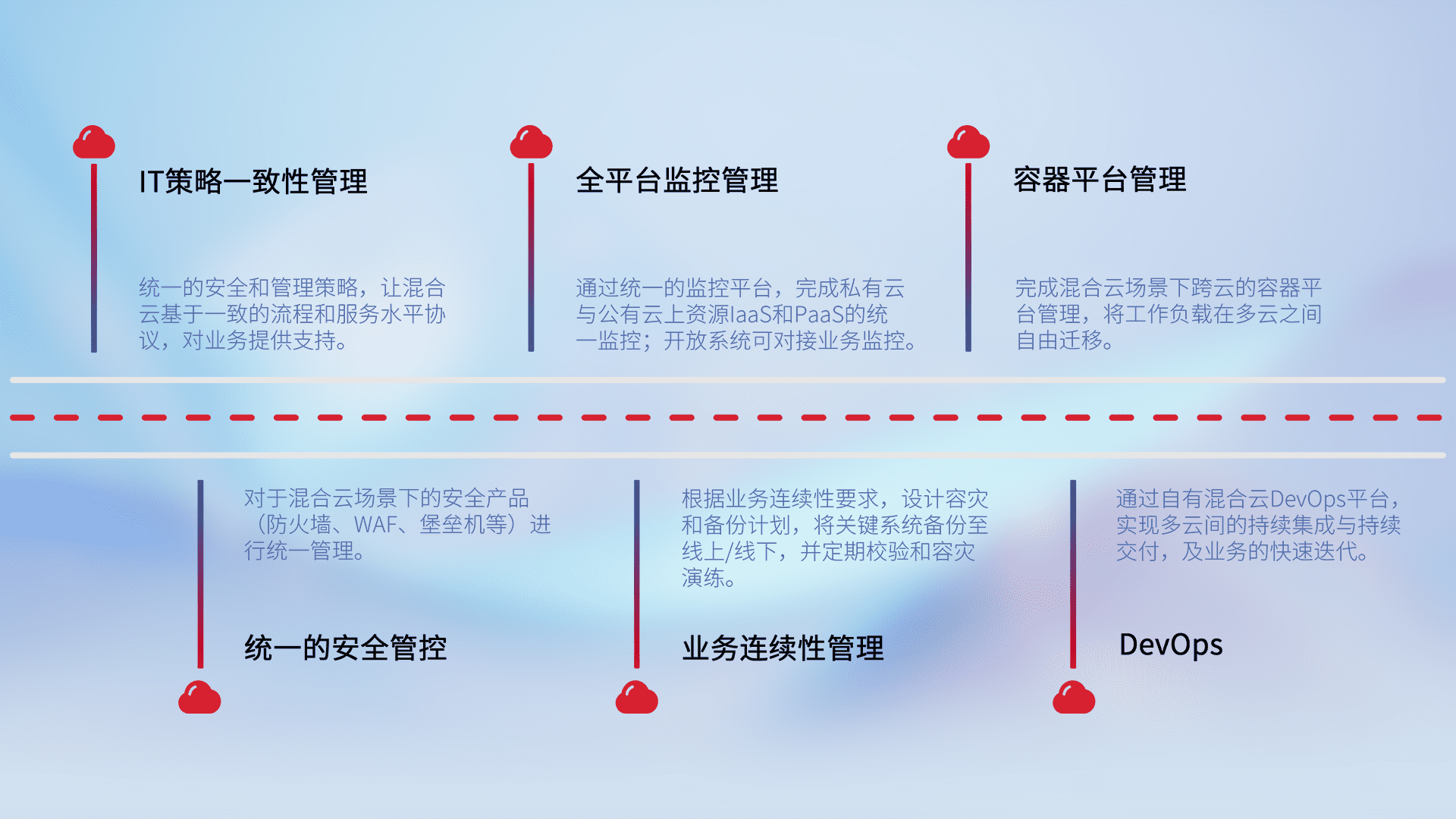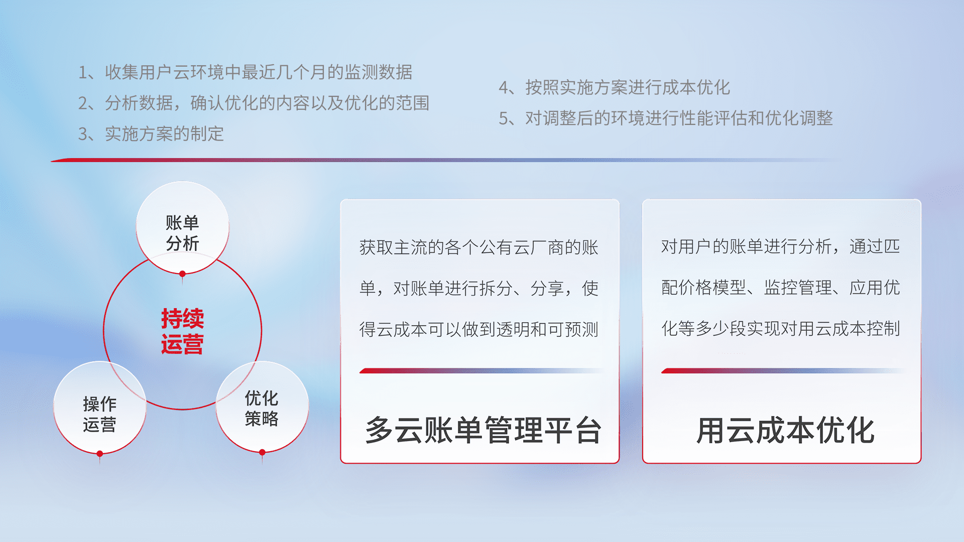 通过多云纳管,,,以统一的资源数据模型把客户的云资源进行抽象和封装,,,,进而实现对多云资源的统一操作,,保障云资源管理的可靠性、、、、稳定性与可用性。。。。量身定制化运维内容,,,配置、、开发运维、、、补丁管理、、、、备份、、、、监控、、认证和访问管理、、审计和日常巡检等,,,,保障在用云过程中的可靠度,,稳定度以及高可用率。。